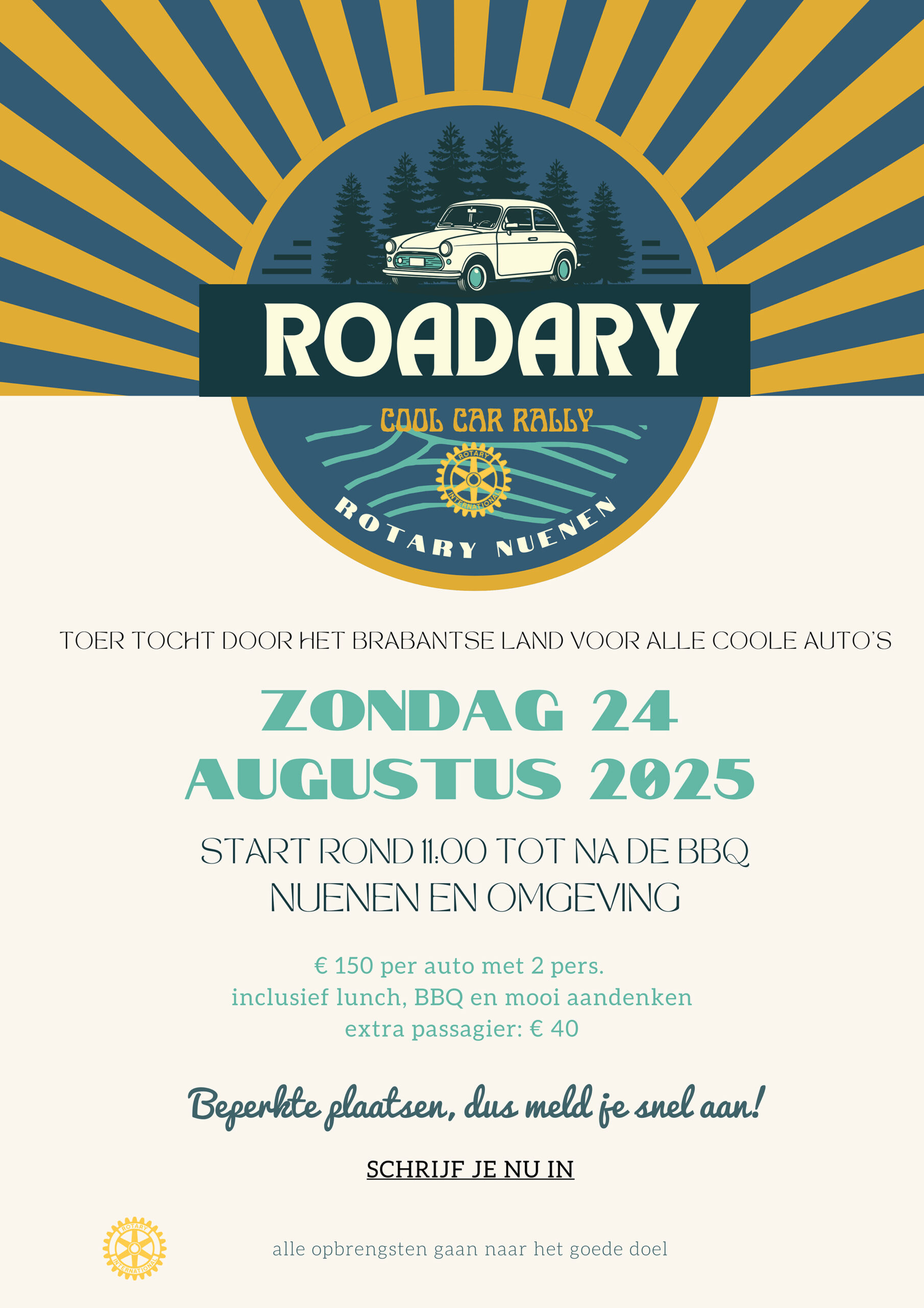 Heb jij een bijzondere auto en zin in een onvergetelijke dag? Doe dan mee aan de ROADARY, een unieke rally georganiseerd door Rotary Nuenen op zondag 24 augustus 2025. Geniet van een mooie route door Nuenen en omgeving, inclusief een gezellige lunch, een heerlijke barbecue en een blijvend aandenken.